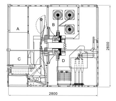 | Boyutlar (- WxDxH): 1400x2800x2600 | A:nahtarın yapısının şematik diyagramı A: röle cihaz odası B otobüs odası C devre kesici odası D kablo |