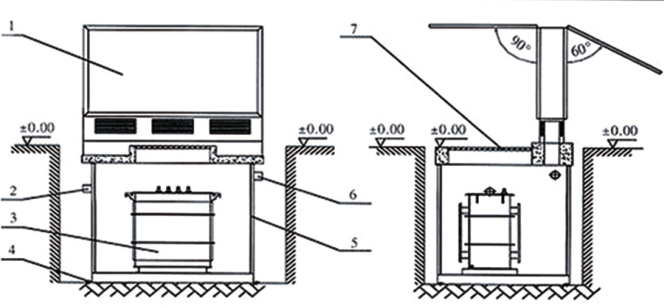 | Fig. 1 Yarı gömülü kutu transformatör yapısının şematik diyagramı 1-Işık kutu tipi güç dağıtım ekipmanı: 2-Yüksek voltajlı kablo giriş deliği; 3- Yeraltı kombine transformatörü: 4-Pitpit temelli montaj deliği 5-Prefabrik zemin oyunu temeli; 6-A:lçak voltaj kablo çıkış deliği; 7-Pit operasyon port kaplaması |