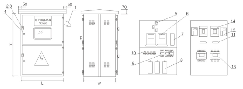 1. Boru 2, kapı kilitleri (açık kilit) 3, kapı kilitleri yağmur kutusu 4, kapı kilitleri (gizli kilit) 5, akım transformatörü 6, metre 7, bağlantı kutusu 8, kapasitör 9, değişme füzyon kontaktor 10, küçük devre kesici 11, izolasyon anahtarı 12, sıfır dizi transformatörü 13, sızıntı akım devre kesici 14, çıkış A:C kontaktor 15, çıkış hava anahtarı